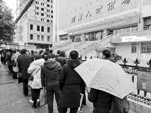 在河南人才市场门前,求职的人排起了长队 省人才交流中心供图
