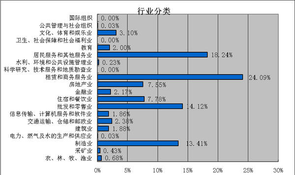 分析显示,一季度,从产业和行业用人需求情况来看,租赁和商务服务业提供岗位占比为24.09%,居民服务和其他服务业提供岗位占比为18.24%,批发和零售业提供岗位占比为14.12%,制造业提供岗位所占比重为13.41%,住宿和餐饮业提供岗位所占比重为7.78%,房地产业提供岗位所占比重为7.55%,居民服务和其他服务业的用人需求增长较快,第三产业所属行业用人需求比重较大。