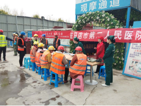 这是4月5日,碧桂园西湖项目邀请郑州高新区瑞达社区卫生服务站、郑州济民中医院的医护人员,到一线为工友开展的义诊活动现场。这场活动持续了两天,为近百名工友进行了检查。