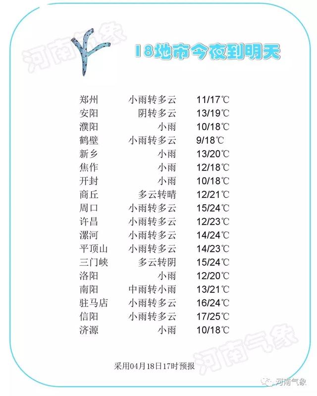 今天,全省多云间阴天,其中黄河以北和三门峡、洛阳、平顶山、漯河、南阳、驻马店、信阳七地区及郑州地区西部有分散性阵雨;其它地区多云。