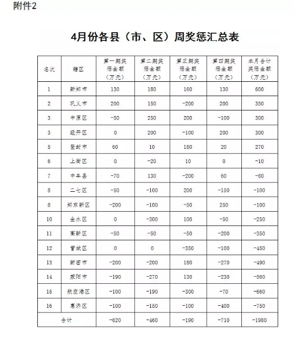 根据《关于印发郑州市县(市、区)环境空气质量周奖惩月排名办法的通知》,现将对4月份环境空气质量月排名情况通报如下: