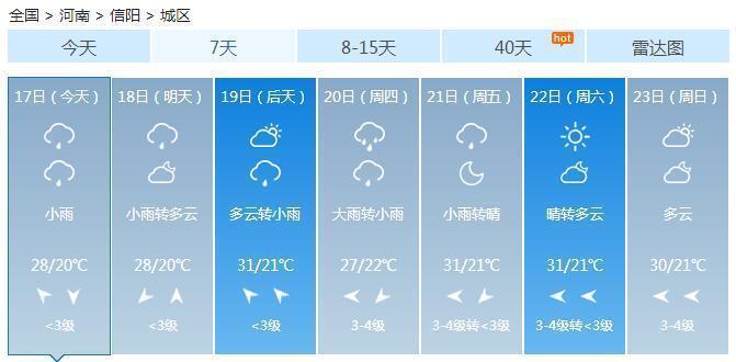 今天白天到夜里,南阳、信阳、驻马店、平顶山、漯河五地区和三门峡、洛阳、许昌、周口、商丘五地区南部多云转阴天,大部分地区有阵雨、雷阵雨,其中信阳地区和驻马店地区南部部分地区有中雨,局部大到暴雨并伴有短时强降水、短时大风等强对流天气;其它地区多云。北部偏北风转偏南风,其它地区偏南风,全省风力2到3级。