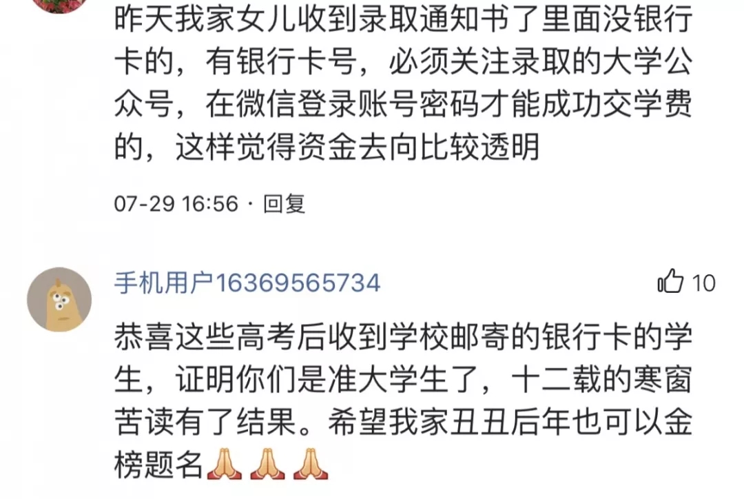 各大高校的录取通知书陆续发放,同学们收到了自己的录取通知书后发现里面有一张银行卡。