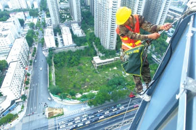 在郑州市嵩山路上,一栋28层的高楼楼体外侧,几名“蜘蛛人”正上上下下地忙着安装灯具,冯志刚就是他们中的一个。