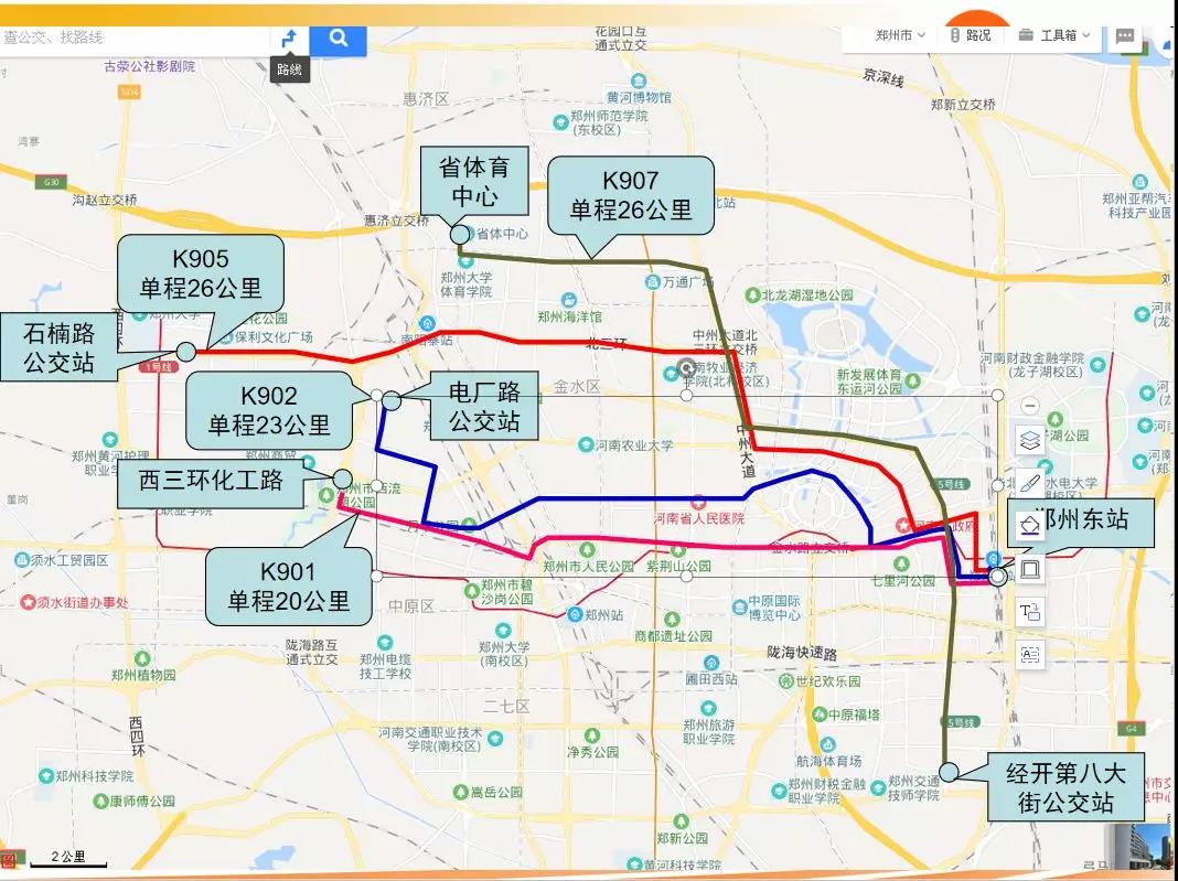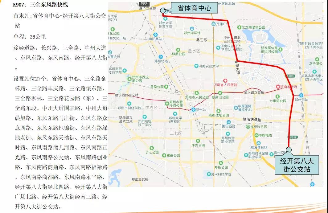 根据市民的建议,金水快线K901路由中原路调整金水西路,形成东西贯穿的金水路快线;黄河快线K902路调整为五龙口南路桐柏路并延伸至郑州东站;北环快线K905延伸至郑州东站;三全东风路快线K907延伸至经开第八大街公交站。