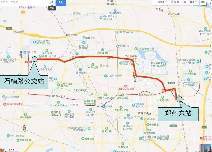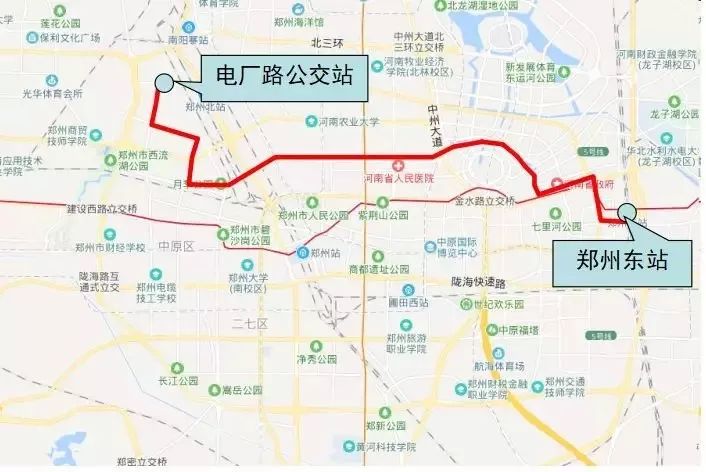 途径道路: 电厂路、五龙口南路、桐柏路、西站路、黄河路、黄河东路、黄河南路、金水路、东风南路、商鼎路。