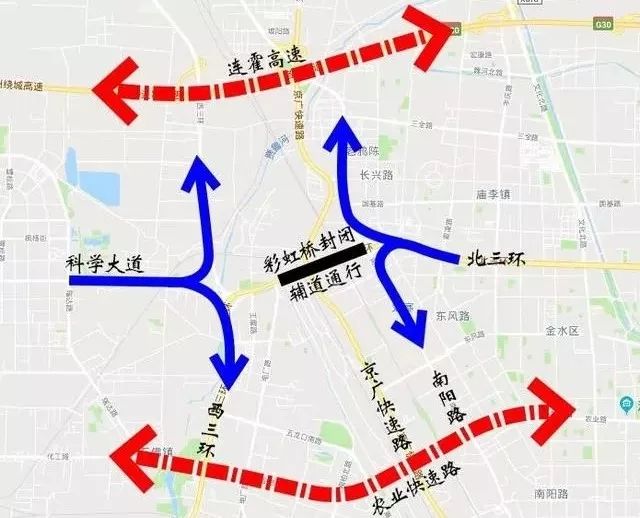郑州北环彩虹桥存在较大安全隐患,将进行封闭施工。期间桥上禁止一切车辆、行人通行,桥下地面辅道正常通行。那么问题来了,每天的必经之路该怎么走呢?