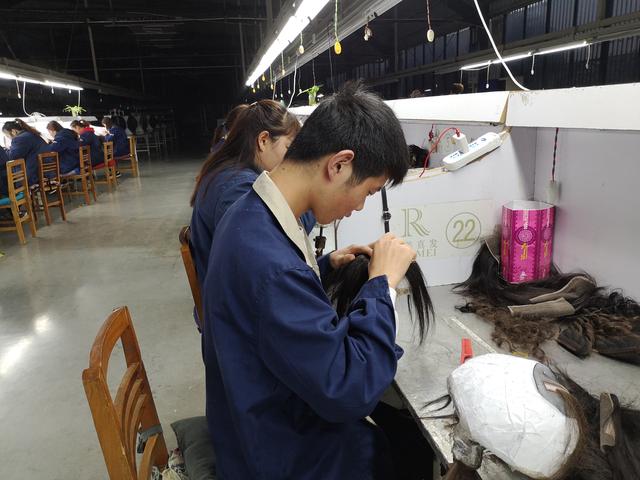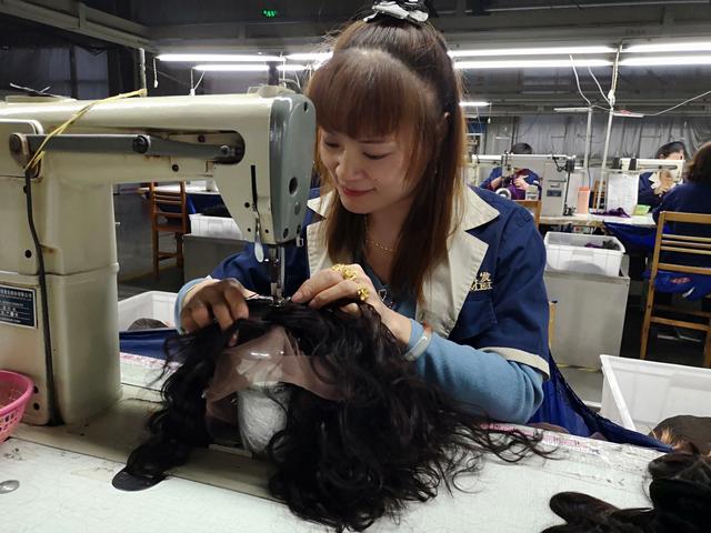 在假发制作的几十道工序中,这一程序称为“手织”,其它的就需要过机器。瑞美生产假发的有真发和假发两种发套,大多向欧美和非洲出口。双十一前夕,工厂的繁忙更为明显,国外订单在翻倍增长,加班也成了节前的常态。