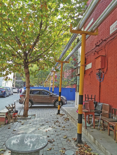 11月13日,记者在现场看到,该小区暖气管网架设半空,多根铁柱支撑的管网,从一栋楼穿过一栋楼(有图)。