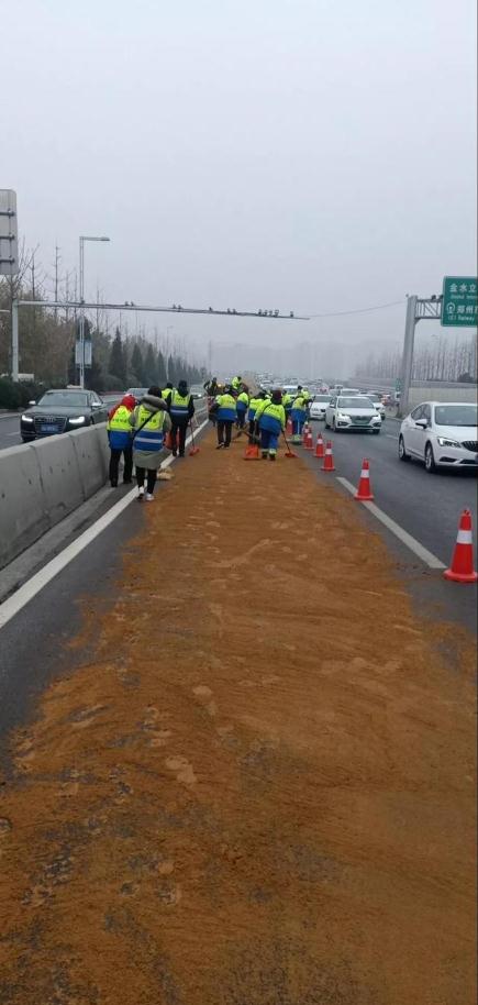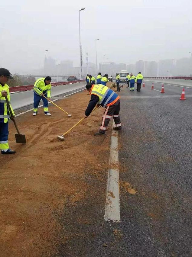 随后,环卫处的工作人员也开始事故对路面进行处理,用土覆盖油污,道路也开始恢复正常。
