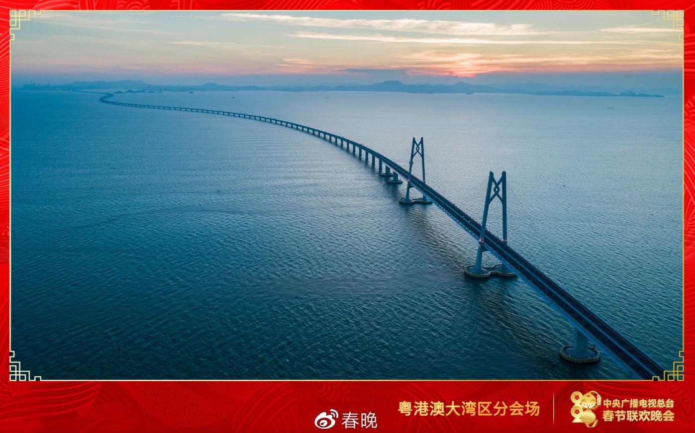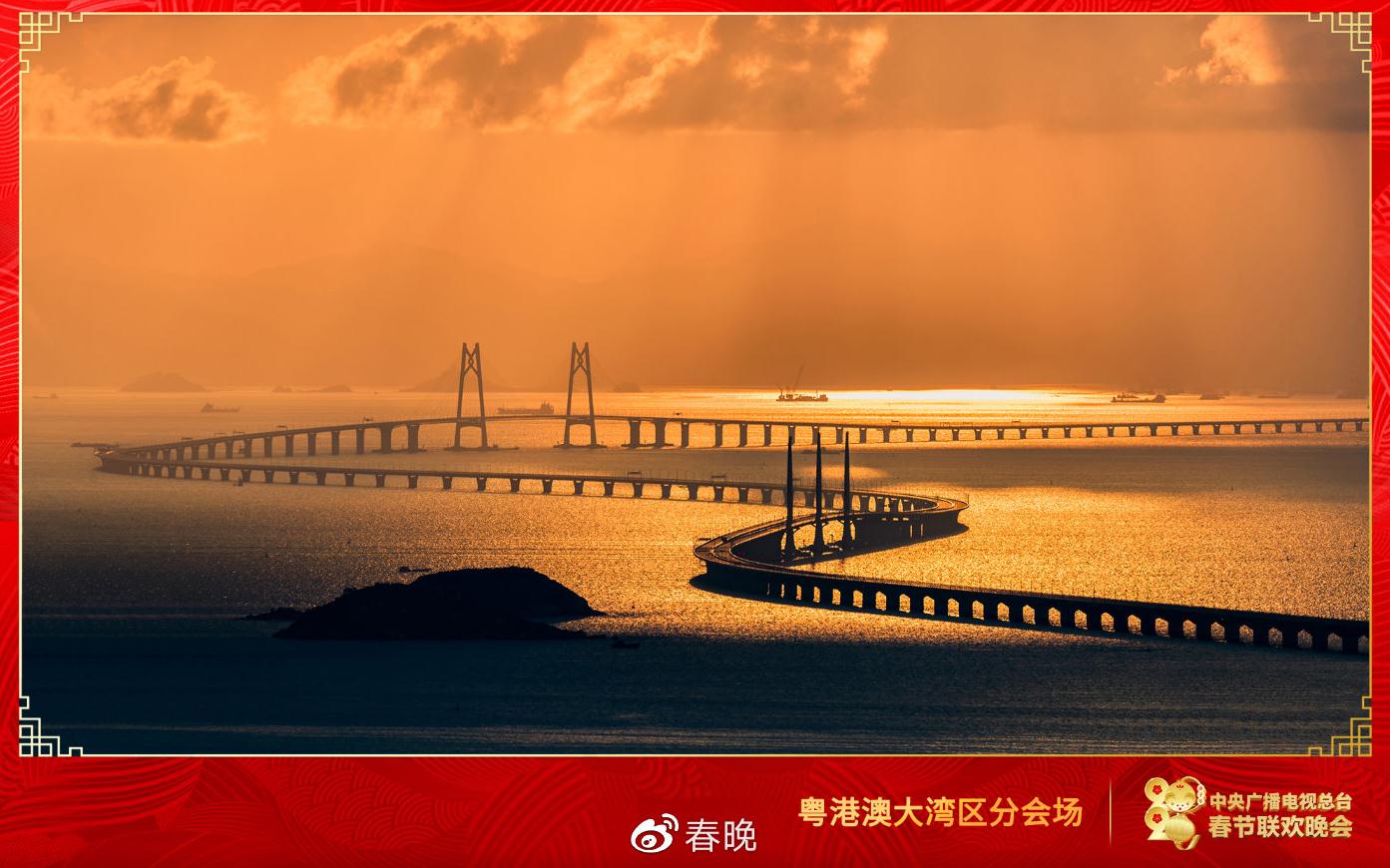 粤港澳大湾区分会场取景港珠澳大桥白海豚岛,融合大湾区人文精神和文化特色,展示大湾区发展成果,呈现流光溢彩的湾区城市群像,描绘出粤港澳三地共迎新春、大湾区同创未来的盛世图景,充分彰显粤港澳大湾区加快建设富有活力和国际竞争力的一流湾区和世界级城市群的美好前景。