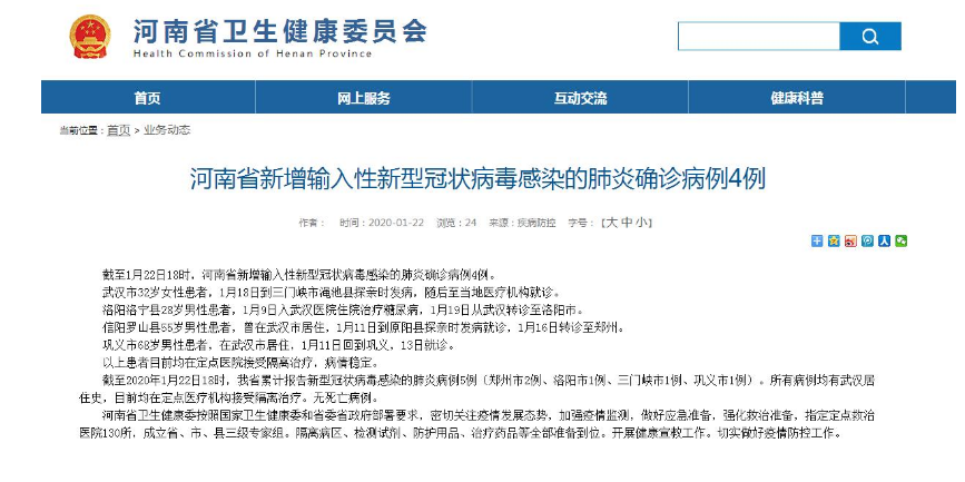 截至1月22日18时,河南省新增输入性新型冠状病毒感染的肺炎确诊病例4例。