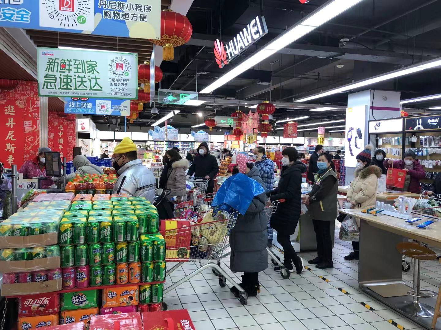 2月7日,记者在丹尼斯大卖场人民店看到,卖场对购物人员管控措施升级。购物人员保持两米左右间隔排队进场,在大门口测量体温后,体温正常者可进行身份证识别系统验证,通过后进场购物,没有携带身份证的顾客需按要求填写个人信息后方可进场。大卖场内生鲜果疏货源充足,鸡蛋、鲜肉、米、面等都能正常供应。