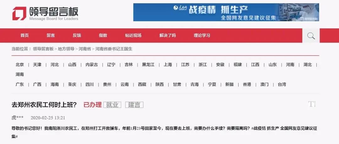 25日,一名家住南阳淅川的网民通过人民网《领导留言板》给河南省委书记王国生留言,称自己在郑州开救护车,年前1月23号回家至今,现在要去上班,需要办什么手续?需要隔离吗?