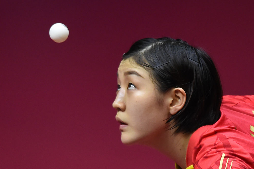 ↑3月8日,陈梦在比赛中发球。
