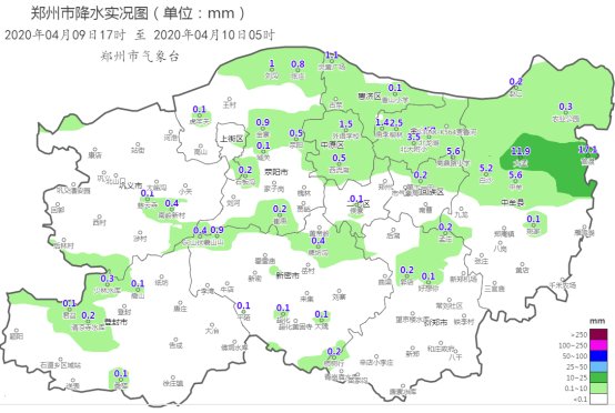 昨夜风降水,分布有点不均,有些夏季强降水的特点,比如短时雷暴、大风等。根据郑州市气象台监测,4月9日17时至10日5时,郑州市出现阵雨、雷阵雨天气。雨量较大的站点有(毫米):郑州的商鼎路小学5.6;中牟县的官渡17.1;荥阳市的刘沟1.0;巩义市的南岭新村0.4;登封市的少林水库0.3;新密市的尖山0.9;新郑市的柿树行0.2。