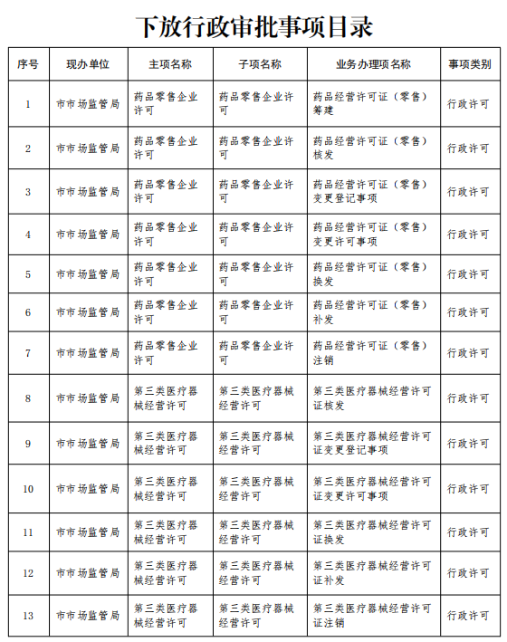 ➤大力推进“就近办”,全面下放登记审批许可权限。将一般有限公司企业登记,冠省名称企业名称核准,特种设备使用登记,药品零售企业许可,一类医疗器械产品备案、一类医疗器械生产备案,二类医疗器械经营备案,三类医疗器械经营许可,医疗器械网络销售备案,医疗器械出口备案全部下放至县(市、区)、开发区办理(见附件)。实行企业名称“谁登记、谁核准”,市级无需二次审核。开办药店、医疗器械店,只需一次提交申请,便可办完所有登记审批许可手续,开店经营。