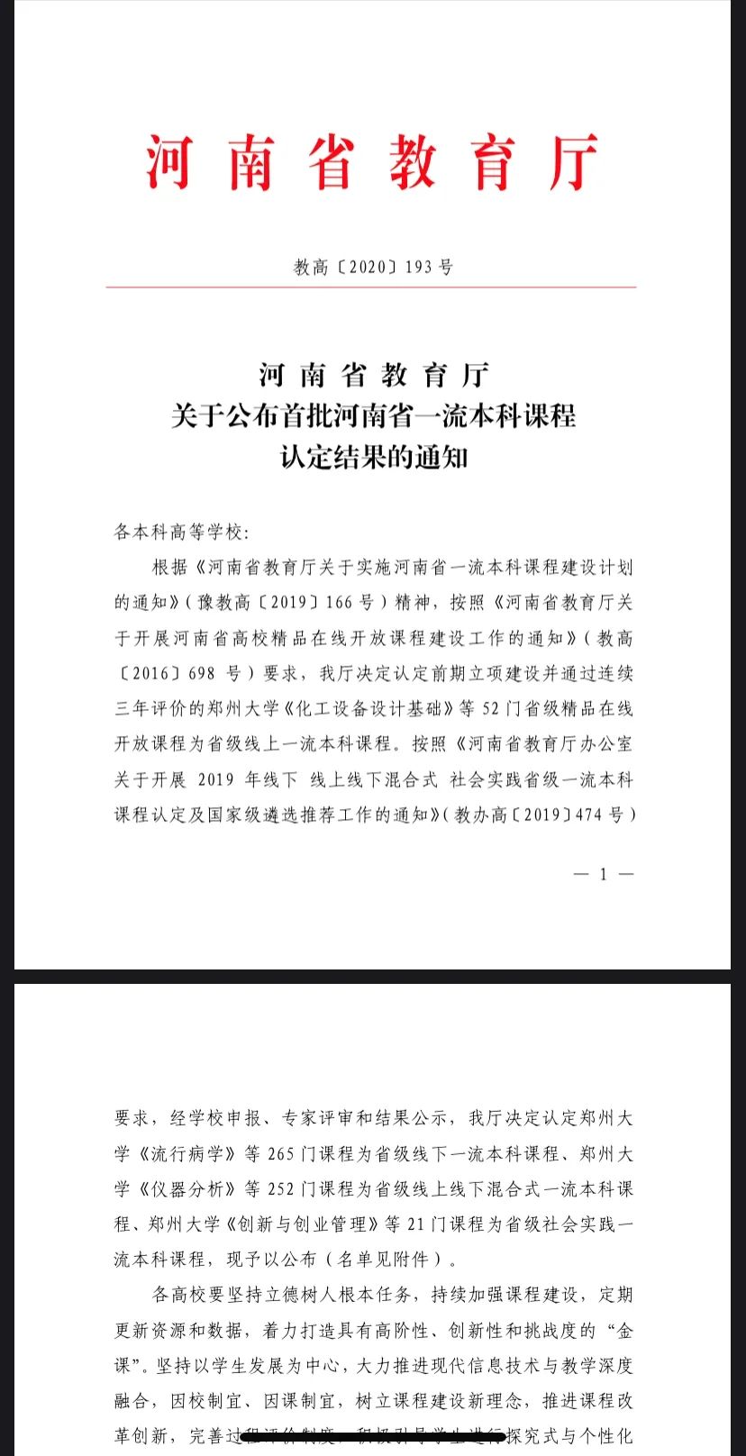 近日,河南省教育厅发布了《关于公布首批河南省一流本科课程认定结果的通知》,郑州科技学院4门课程获批省级一流本科课程。