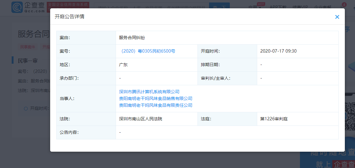 另据企查查显示,腾讯与老干妈另有一场“服务合同纠纷”待审,该案也将在深圳南山法院审理,开庭时间是7月17日。