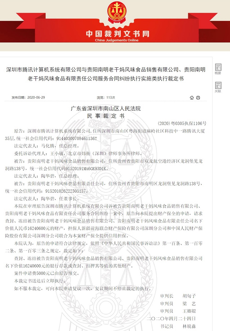【大河报·大河财立方】腾讯把老干妈告了。6月29日,中国裁判文书网发布《深圳市腾讯计算机系统有限公司与贵阳南明老干妈风味食品销售有限公司、贵阳南明老干妈风味食品有限责任公司服务合同纠纷执行实施类执行裁定书》,腾讯向该院提出财产保全的申请,请求查封、冻结被告老干妈约1624万元财产。对此申请,审理该案的深圳市南山区人民法院在4月24日作出判决予以支持。