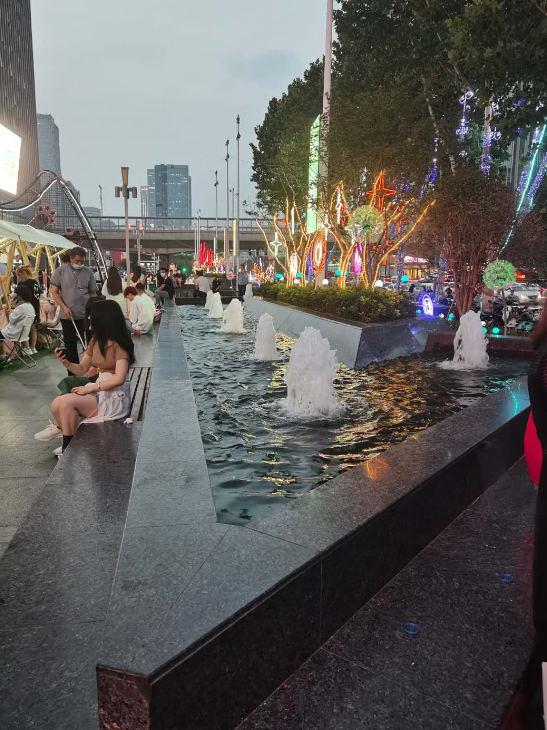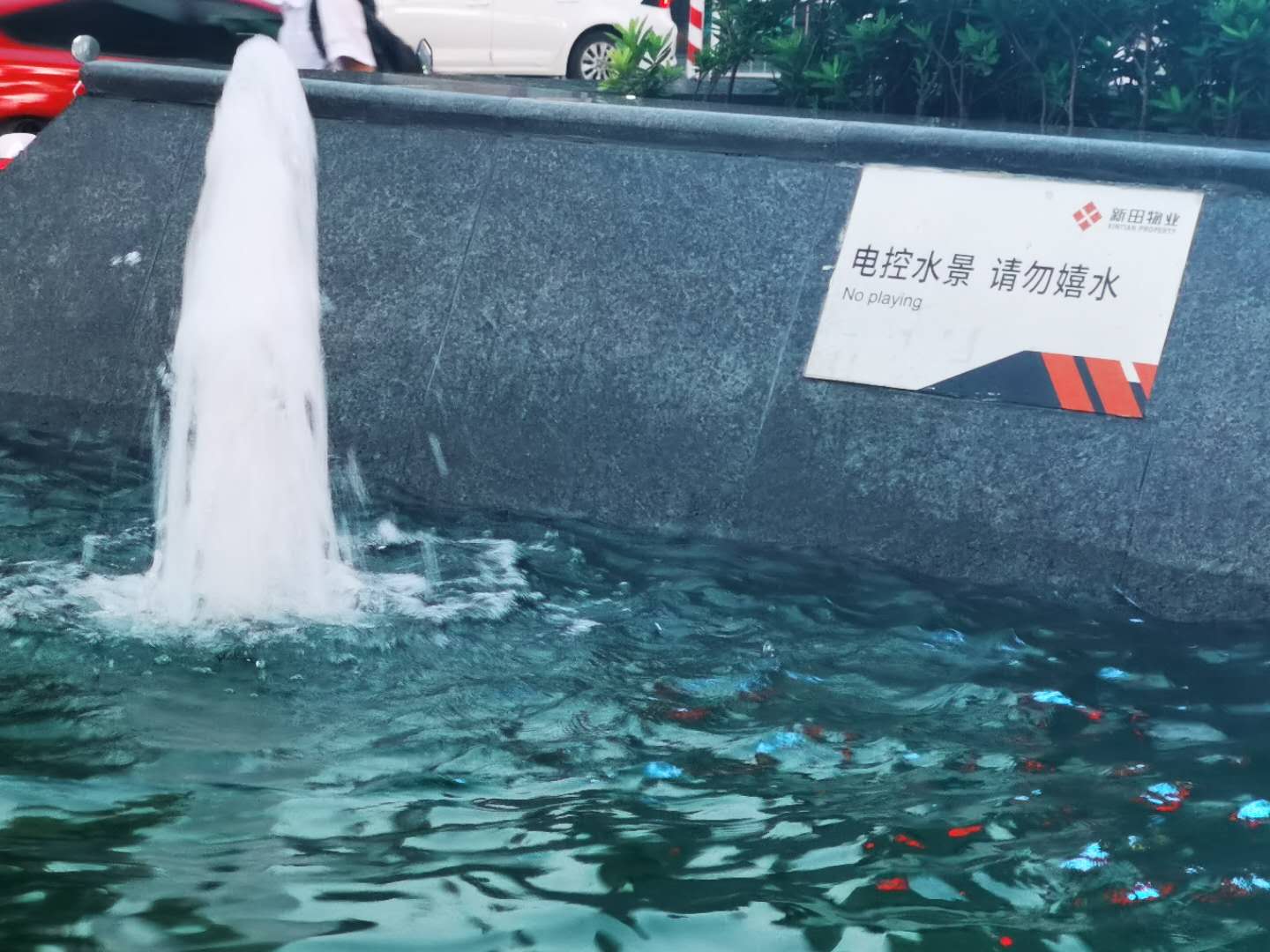 7月28日,在郑州市农业路和花园路交叉口西南角某商业广场上,也有景观喷泉水系。因水系旁边是一排休闲座椅,很多带孩子前去游玩的家长会在此坐着休息,有的孩子直接把手伸到水里撩水玩。