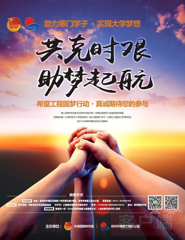 为贯彻落实习近平总书记对希望工程30周年寄语精神,切实帮助郑州市2020年即将考入大学的贫困学子渡过难关,实现上大学的梦想,即日起至9月底,共青团郑州市委、郑州市希望工程领导小组办公室共同启动2020年“郑州希望工程圆梦行动”。