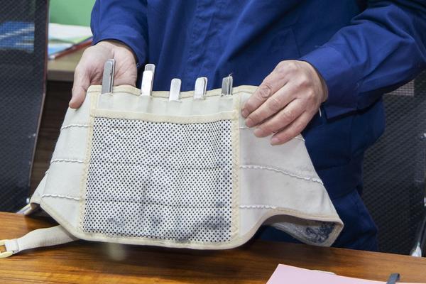由于长时间超负荷的工作,王建勋得上了腰椎间盘突出症。他没有告诉任何人,而是买来10根钢条,把它们穿插在医疗护腰带上,给自己特制了一条“钢板”腰带,一干活就戴上它。现场,在大家的提议下,王建勋从腰上解下了“钢板”腰带展示,一条条钢条分外“刺目”,它支撑着王建勋的脊梁,也见证着他的默默奉献。