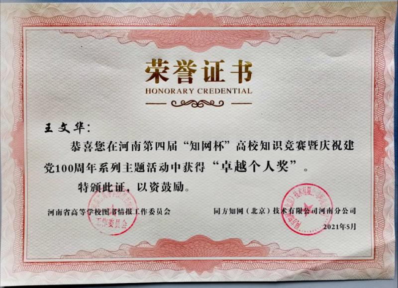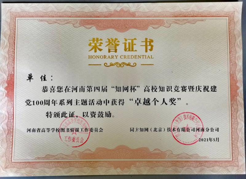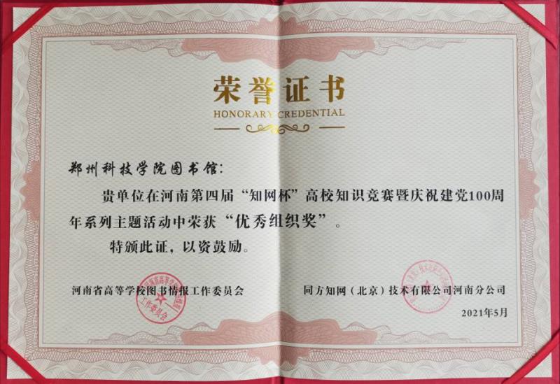 近日,从河南省第四届“知网杯”高校知识发现有奖竞赛河南赛区组委会传来消息,郑州科技学院图书馆荣获“优秀组织奖”,王文华、单佳、王晓梦等28位同学荣获省赛“卓越个人奖”。
