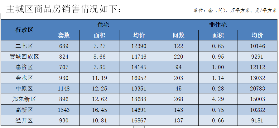 郑州全市商品房销售13723套(间),销售面积152.22万平方米,销售均价12530元/平方米;其中商品住宅销售11910套,销售面积136.78万平方米,销售均价12725元/平方米。非住宅销售1813套(间),非住宅销售面积15.44万平方米,非住宅销售均价为10808元/平方米。