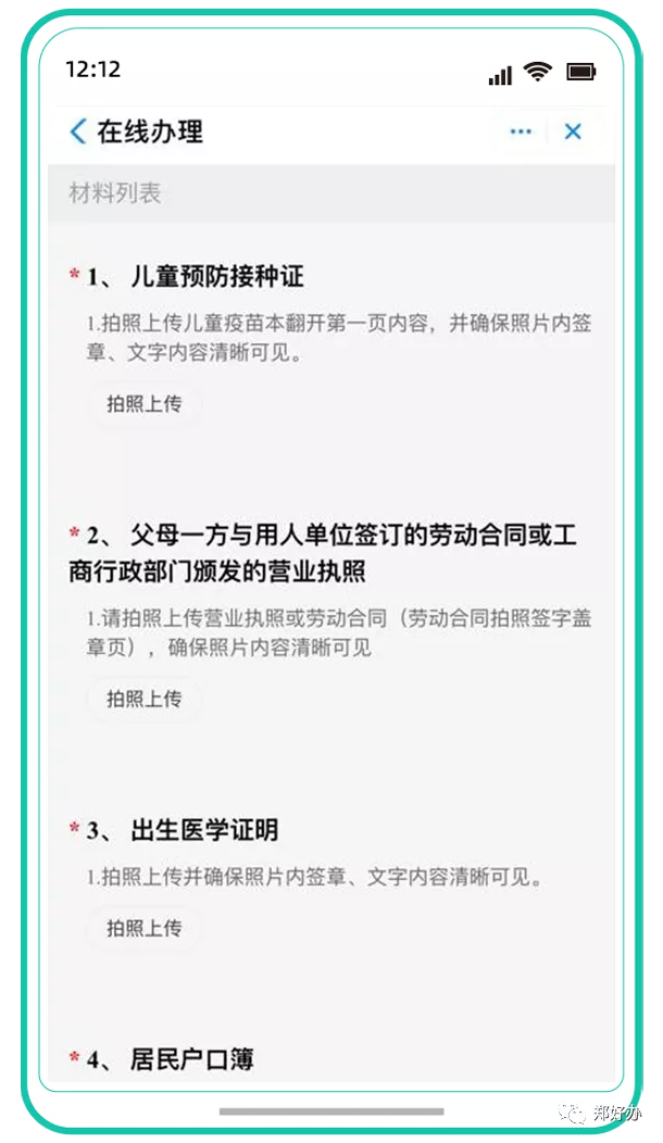 4.上传材料:申请人仔细阅读材料上传要求,分别上传儿童预防接种证、父母一方与用人单位签订的劳动合同或工商行政部门颁发的营业执照、出生医学证明、居民户口簿、父母二代居民身份证、居住证、房产证或不动产权证、其他证明材料(无房证明可通过郑好办App下载并打印)。