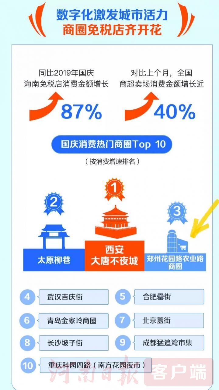 近日,支付宝开放平台发布国庆消费报告。根据报告显示,全国商超卖场消费金额环比上个月增长近40%。其中,郑州花园路农业路商圈作为河南省核心商圈,消费热度位列全国第三,城市活力突显。