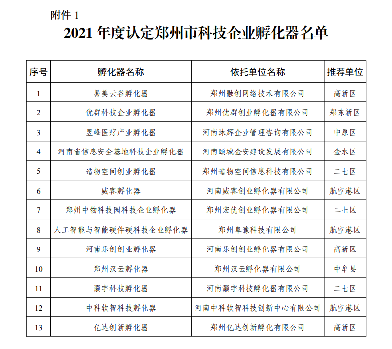 【大河财立方消息】10月19日,郑州市科技局发布关于公布2021年度认定郑州市科技企业孵化器备案郑州市众创空间名单的通知,同意易美云谷孵化器等13家科技企业孵化器认定为郑州市科技企业孵化器,同意奥特科创众创空间等16家众创空间备案为郑州市众创空间,以上29家载体同时纳入郑州市市级孵化载体服务和管理体系。