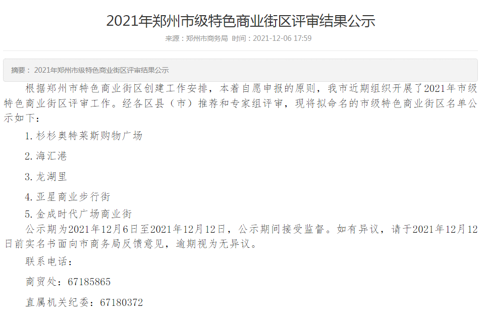 12月8日消息,郑州市商务局公示2021年郑州市级特色商业街区评审结果,拟将杉杉奥特莱斯购物广场、海汇港、龙湖里、亚星商业步行街、金成时代广场商业街命名为市级特色商业街区。