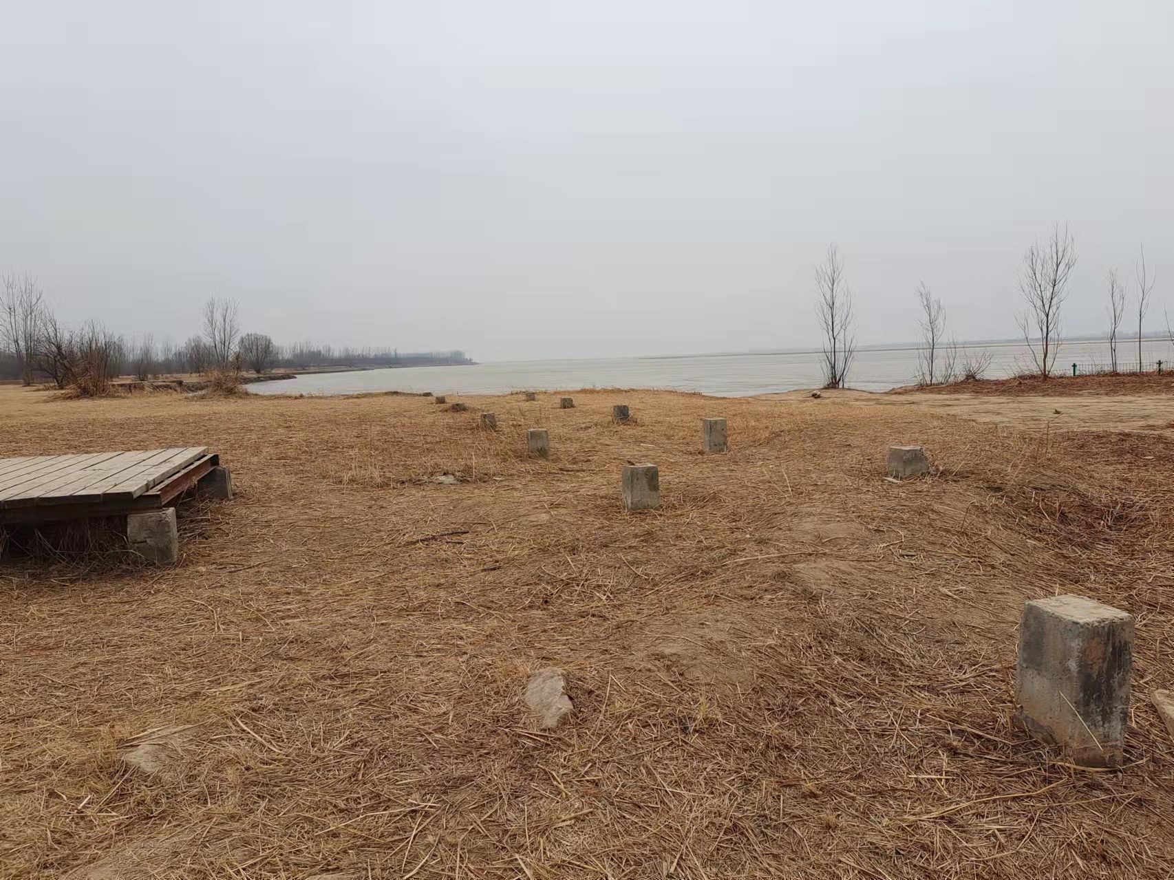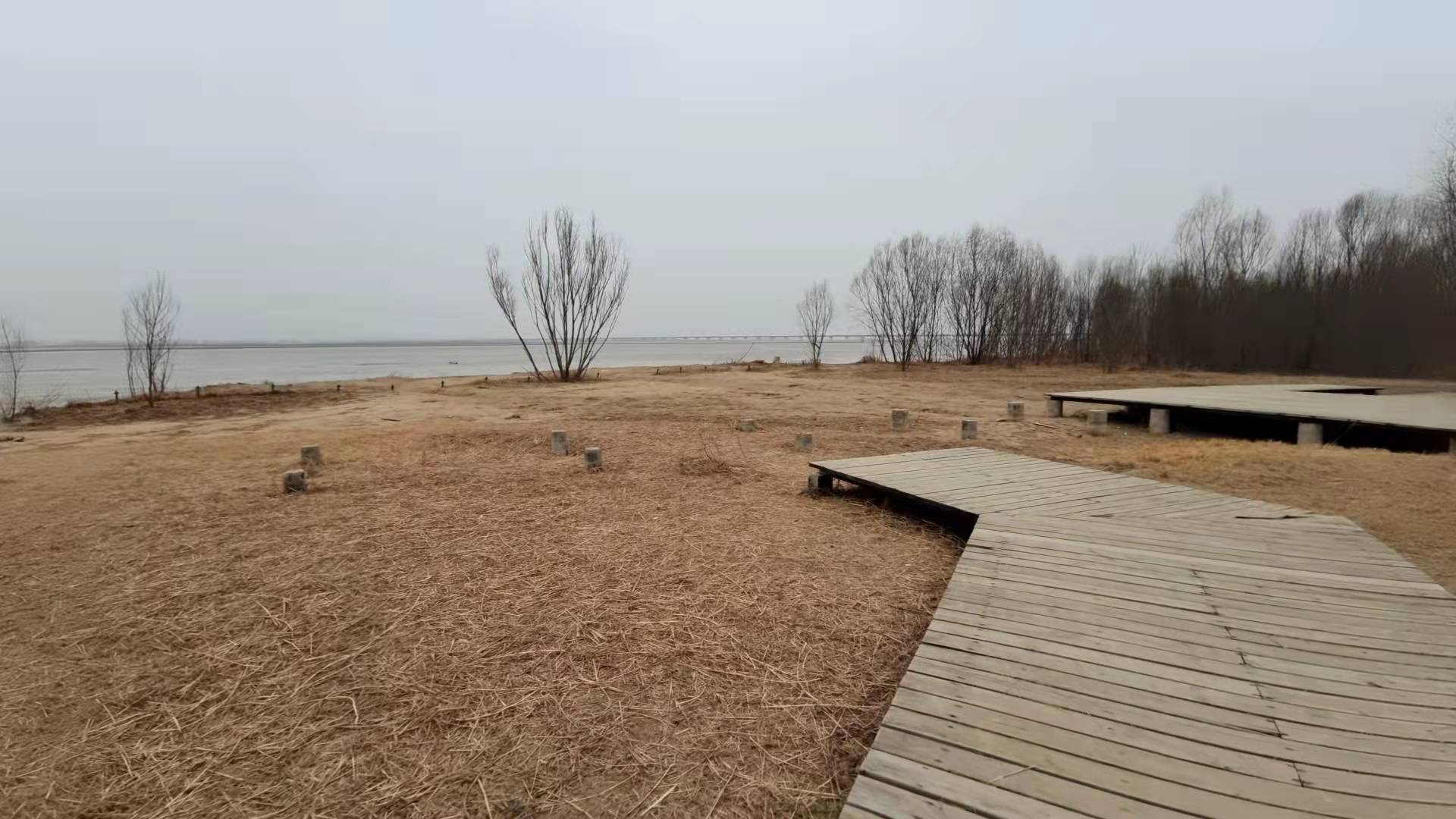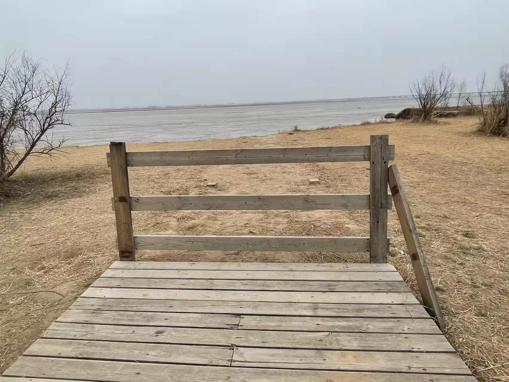 靠近黄河河道位置,有些区域的木栈道出现了大块的缺失,只留下了底部的支撑石墩。而伸向于河道的木栈道,前端已经缺失,为了不让游客沿着木栈道往黄河河道方向走,木栈道尽头临时放置了一个木栏杆。