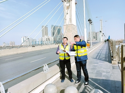 崔健(右)和同事巡查桥梁结构情况