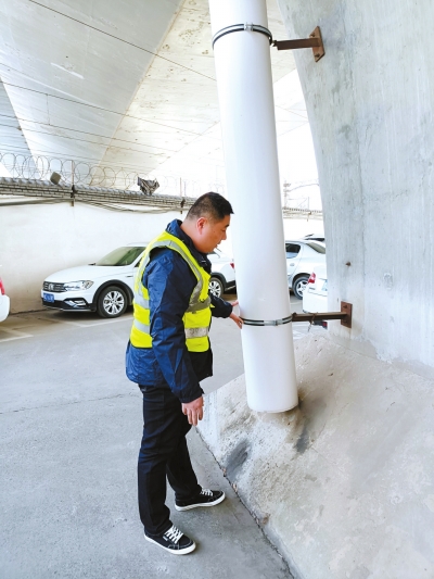 崔健在建设路立交桥下,巡查桥墩和桥梁排水情况。