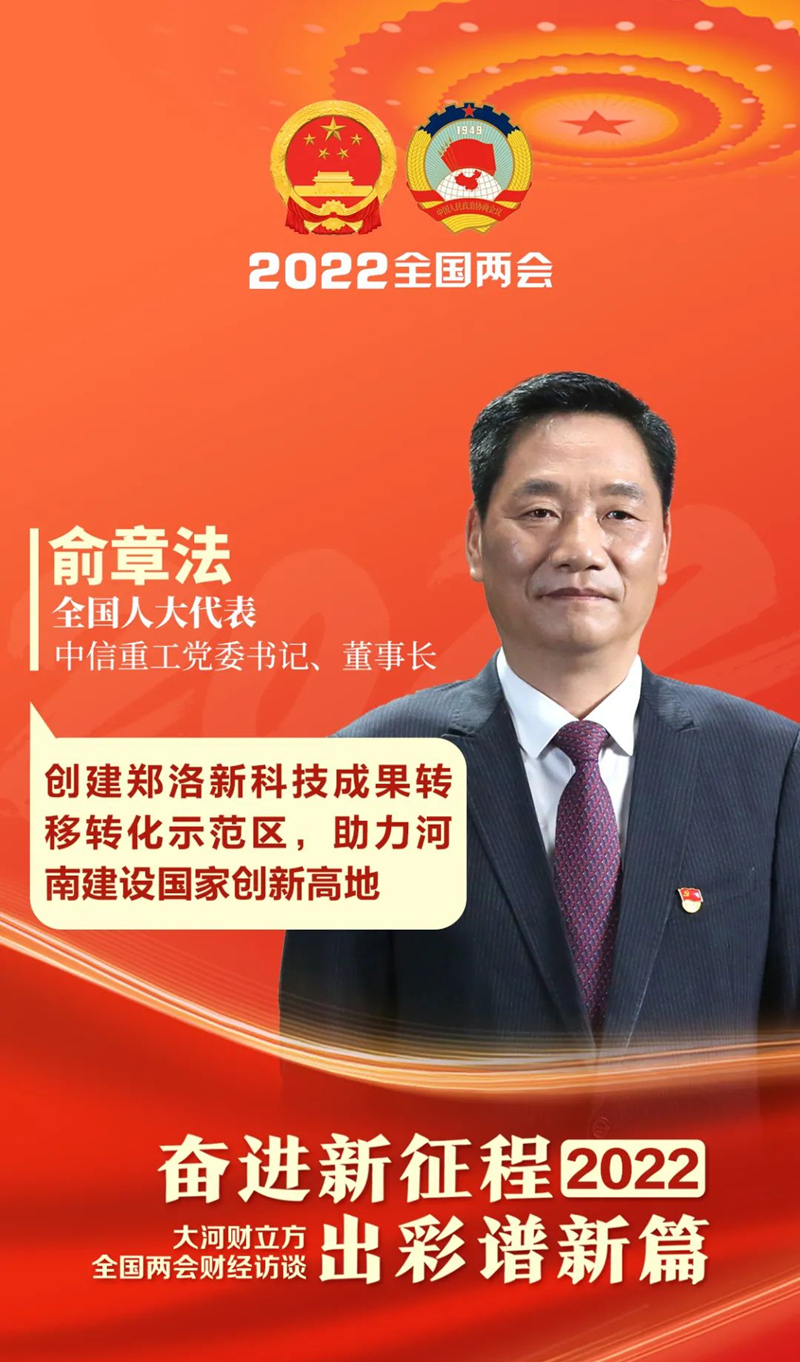 2022年,全国两会期间,大河报·大河财立方记者采访了中信重工机械股份有限公司党委书记、董事长俞章法。今年全国两会,俞章法带来两份建议,分别是关于支持创建郑洛新科技成果转移转化示范区的建议,关于加大首台(套)重大技术装备支持力度、提高关键重大装备国产化率的建议。