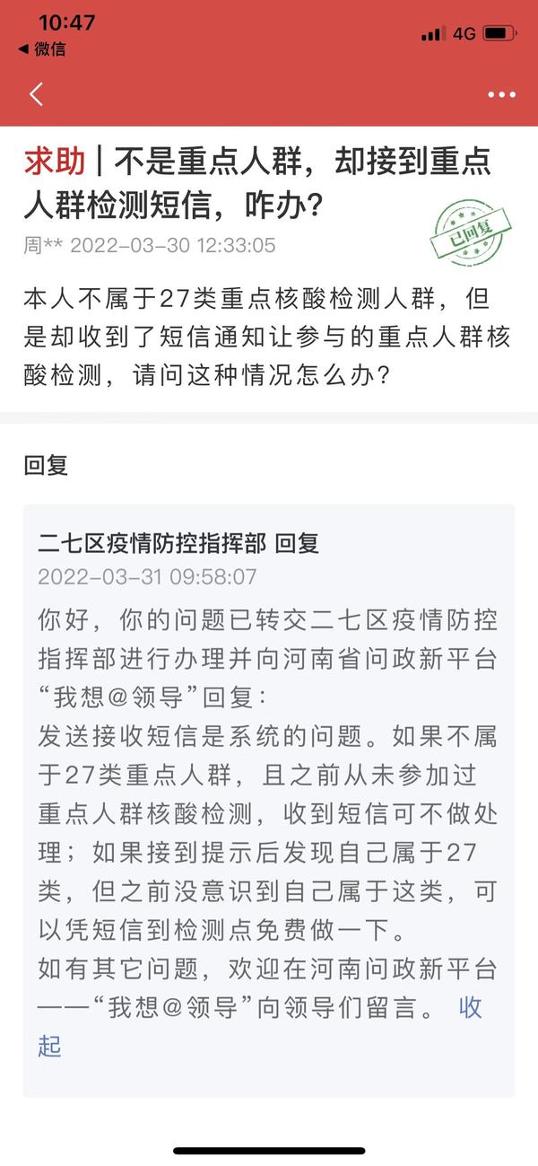 非重点人群却收到重点人群核酸检测的短信提醒,遇到这种情况该怎么办?当天下午,二七区疫情防控指挥部通过我想@领导问政平台回复留言群众。
