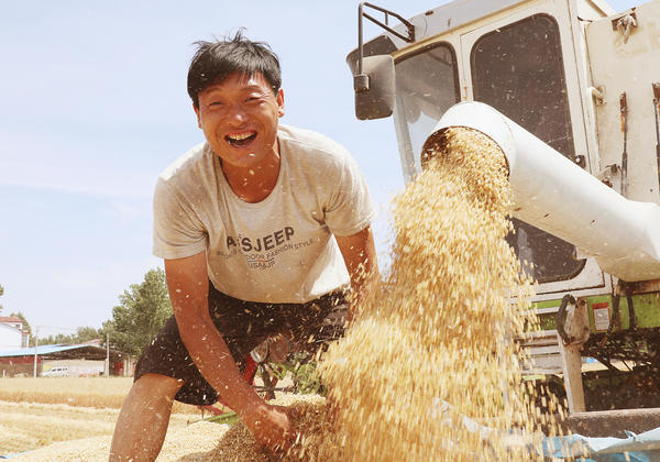 “今年小麦不赖,穗头大,颗粒饱满,一亩地还能打一千多斤,又是个大丰收。”郸城县秋渠乡赵庄村村民范大兰的脸上露出灿烂的笑容,她随手拽了一捧麦穗在手里,搓一搓、再轻轻吹一口气,掌心的麦粒便脱壳而出。
