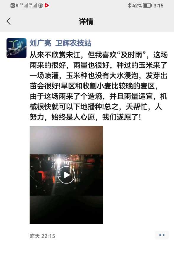 “从来不欣赏宋江,但我喜欢“及时雨”,这场雨来的很好,雨量也很好,种过的玉米来了一场喷灌,玉米种也没有大水浸泡,发芽出苗会很好!旱区和收割小麦比较晚的麦区,由于这场雨来了个造墒,并且雨量适宜,机械很快就可以下地播种!总之,天帮忙,人努力,始终是人心愿,我们遂愿了!”6月9日晚10时15分卫辉市农业农村局农技服务总站站长高级农艺师刘广亮漫步在雨中发布了这条朋友圈。