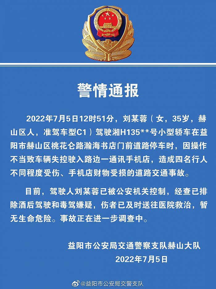 央视网消息:@益阳市公安局交警支队 微博消息,7月5日12时51分,刘某蓉(女,35岁,赫山区人,准驾车型C1)驾驶湘H135**号小型轿车在益阳市赫山区桃花仑路瀚海书店门前道路停车时,因操作不当致车辆失控驶入路边一通讯手机店,造成四名行人不同程度受伤、手机店财物受损的道路交通事故。