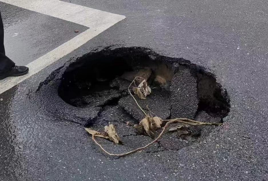 今天下午4时许,司机杨先生驾车行驶至经三路与农科路交叉口南约100米处,看到前方车辆驶过后,路面塌陷出一个坑,他赶紧踩刹车打方向避开,后面的车辆也随即刹车躲避。