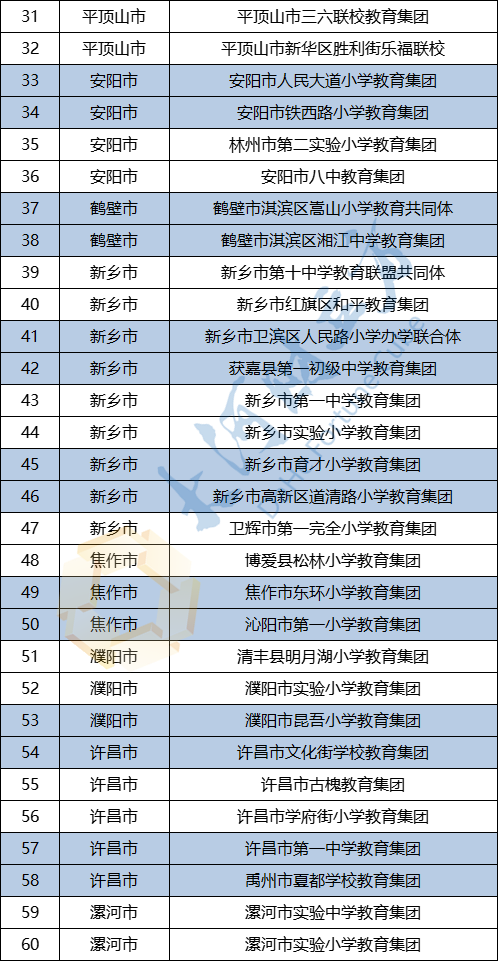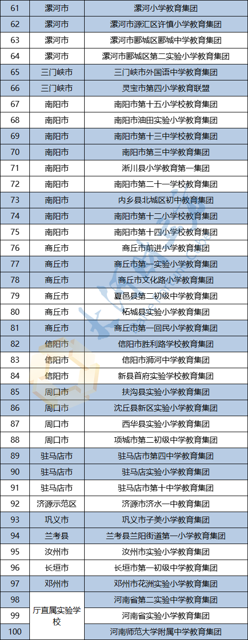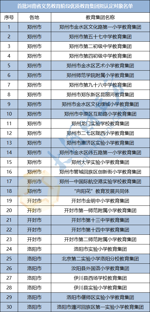 【大河财立方消息】8月11日,河南省教育厅发布首批河南省义务教育阶段优质教育集团拟认定对象,经过自查自评、县级初评、市级复评、省级评审等环节,拟认定郑州市金水区文化路第一小学教育集团等100所教育集团为首批河南省义务教育阶段优质教育集团,公示期为5个工作日。