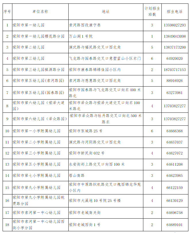 附件:2022年荥阳市公办幼儿园小班招生计划