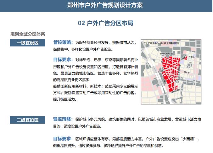 据了解,郑州是采取功能片区主导+城市用地控制的分区方式,划定户外广告控制分区。围绕城市中心、核心商圈划定宜设区;以城市风貌、景观形象、历史文化保护为基准划定禁设区;其他归于严控区进行控制,按用地属性分类管理。