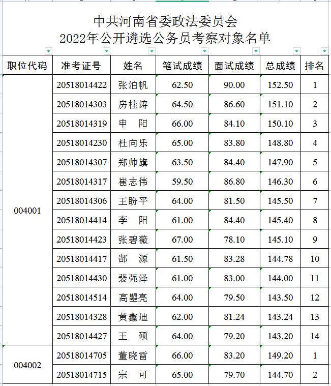 根据《河南省2022年省直机关公开遴选公务员公告》和《河南省2022年公开遴选公务员工作实施方案》有关规定,按照考试综合成绩从高分到低分的顺序、考察对象与拟录用人数1.5:1的比例(按四舍五入计算),确定张泊帆等16名同志为中共河南省委政法委员会2022年公开遴选公务员考察对象(名单附后)。考察拟于2022年9月上旬进行,相关具体事宜将电话通知,请保持通讯工具畅通。