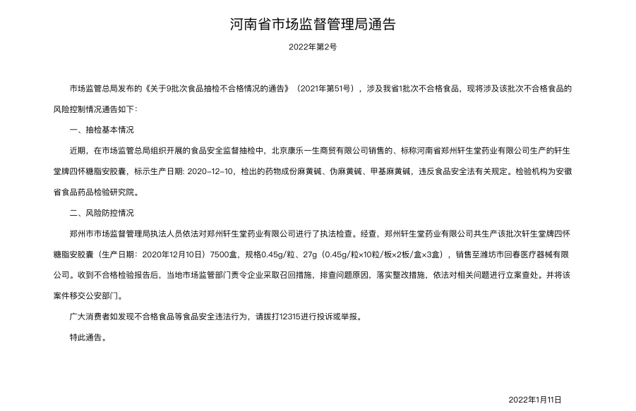 河南省市场监管局今年1月11日发布的不合格食品风险控制情况的通告显示,在市场监管总局组织开展的食品安全监督抽检中,北京康乐一生商贸有限公司销售的、标称河南省郑州轩生堂药业有限公司生产的轩生堂牌四怀糖脂安胶囊,标示生产日期为2020年12月10日,检出的药物成份麻黄碱、伪麻黄碱、甲基麻黄碱,违反食品安全法有关规定。