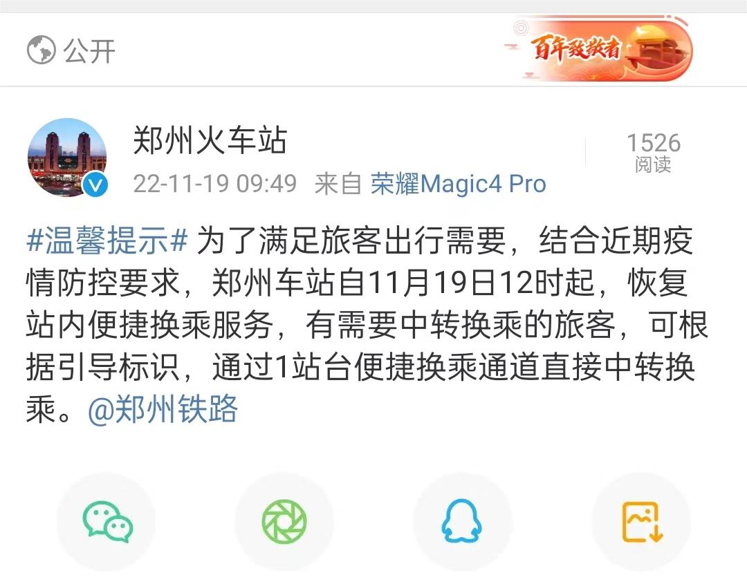 郑州火车站官方微博发布,为了满足旅客出行需要,结合近期疫情防控要求,郑州车站自11月19日12时起,恢复站内便捷换乘服务,有需要中转换乘的旅客,可根据引导标识,通过1站台便捷换乘通道直接中转换乘。
