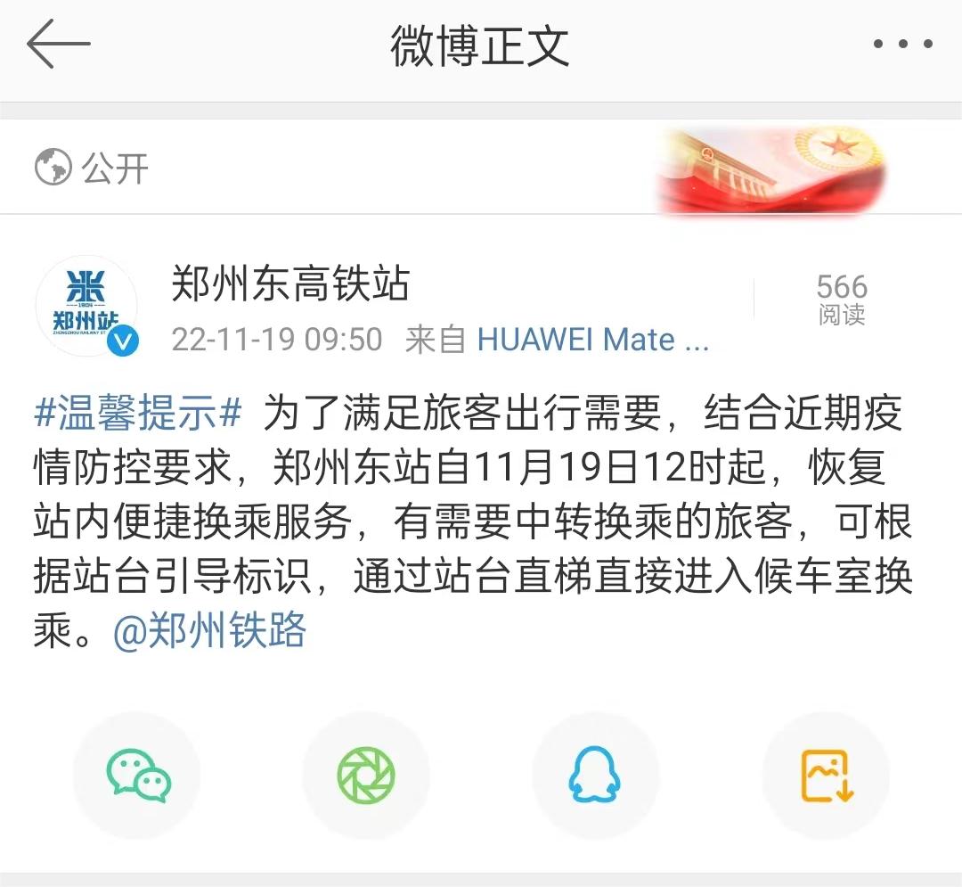 郑州东站官方微博发布:为了满足旅客出行需要,结合近期疫情防控要求,郑州东站自11月19日12时起,恢复站内便捷换乘服务,有需要中转换乘的旅客,可根据站台引导标识,通过站台直梯直接进入候车室换乘。