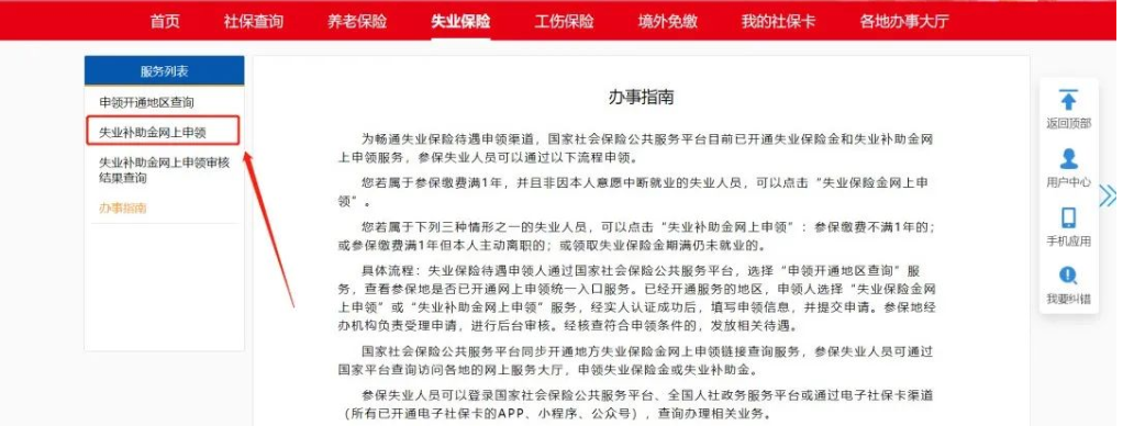 第三步:点击左侧页面的【失业补助金网上申领】,即可在线申领补助金。